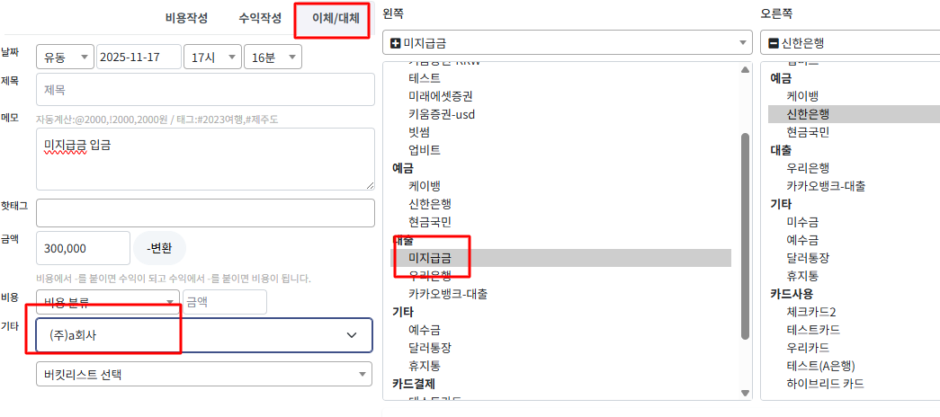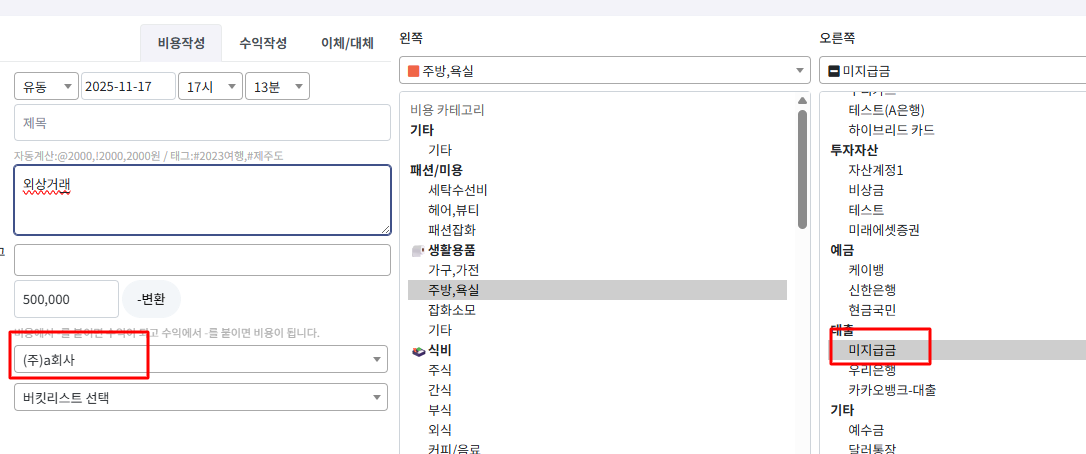 • 오른쪽 계정: 지출(금액이 나가는 계정) 선택