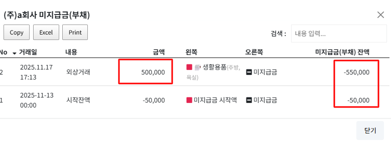 예) 시작금액 –50,000원에서 외상거래 500,000원이 추가되어 잔액이 –550,000원이 됩니다.