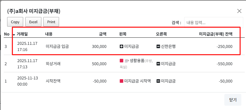 예) 300,000원 지급 후 잔액은 –250,000원이 됩니다.