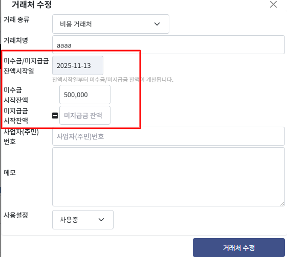 설정 → 거래처 관리에서 미수금/미지급금 잔액 시작일과 해당 날짜 기준의 초기 미수금/미지급금 잔액을 입력합니다.