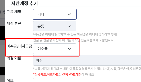 설정 → 자산 계정에서 미수금 계정미지급금 계정을 추가합니다.