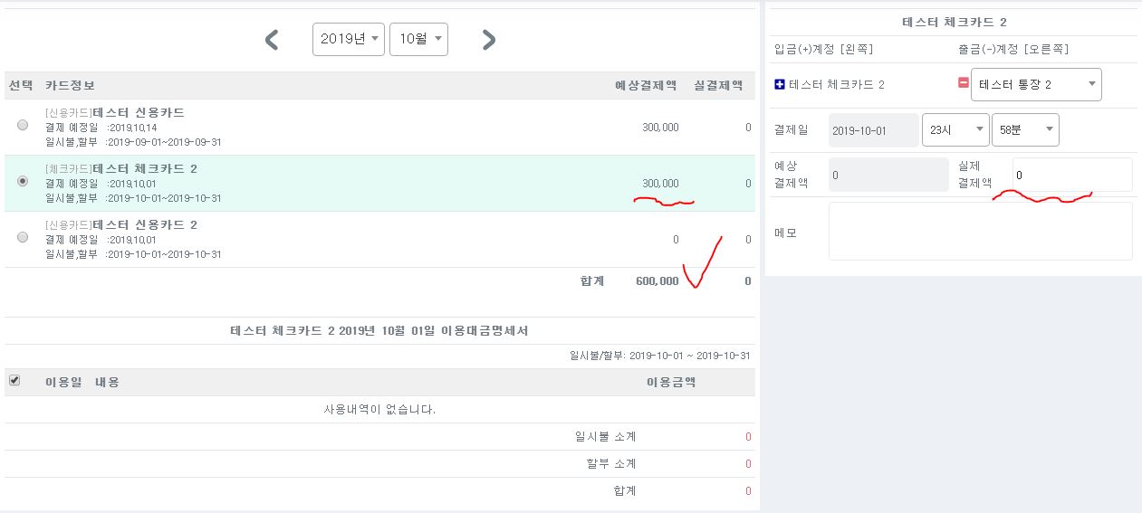 ex) 카드 순서가 1. 신용카드 2. A_체크카드 3. B_체크카드 4. C_체크카드 라고 하면 모든 체크카드에 300,000이 예상 결제액으로 뜹니다.