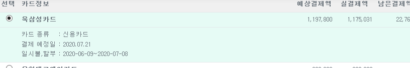 카드대금 이용대금명세서 리스트 전체선택을 클릭하면 선택해제가되고 실제결제액은 0원으로 됩니다.