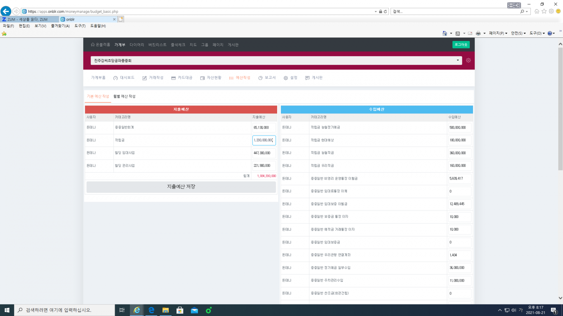 돈테나돈테 돈테나 2021.08.21 #4 감사합니다. 적립금에 보시면 12억을 입력하였는데 10억으로 입력이 되고 예산안이 숫자가 1회 입력했는데 1월부터 12월까지 보고서 보면 자동으로 입력 누계로 나옵니다. 한번만 입력되어야 하는데 첨부 파일 스크린샷(5).png 459.2 Kb . 108 읽음 스크린샷(4).png 454.05 Kb . 109 읽음 스크린샷(3).png 377.77 Kb . 106 읽음