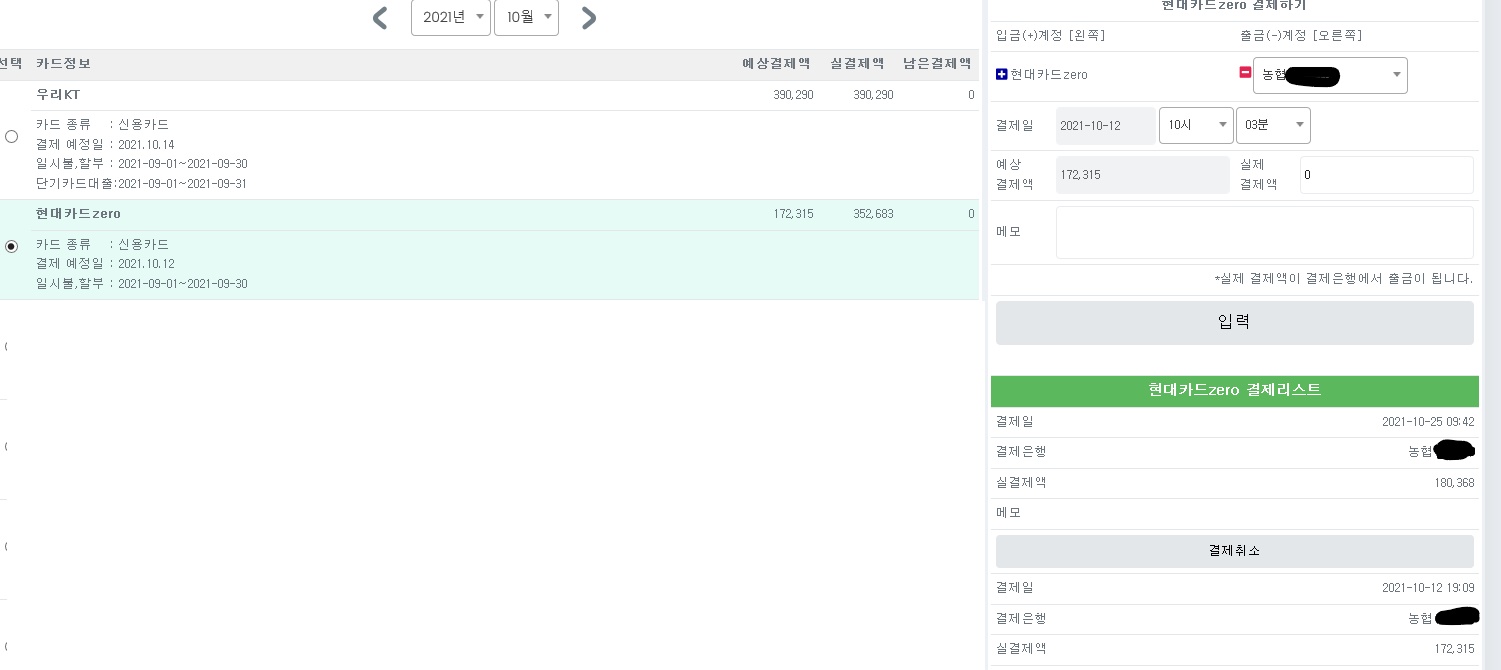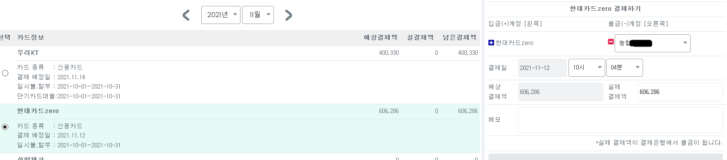 흠냐앙흠냐 흠냐앙 2021.10.25 #0 항상 잘 쓰고 있습니다. 감사합니다^ 11월 카드대금 중 일부를 10월 오늘 선결제 하였습니다. 11월 결제창에서 오늘 날짜를 넣고 결제하기 누르니 10월 카드결제창에는 결제 된 내역이 뜨는데 11월 결제창에선 금액 반영이 안되는 것 같더라구요. 이런 경우엔 어떻게 해야 할까요? 첨부 파일 카드결제 10월.jpg 315.13 Kb . 143 읽음 카드결제 11월.png 17.65 Kb . 132 읽음