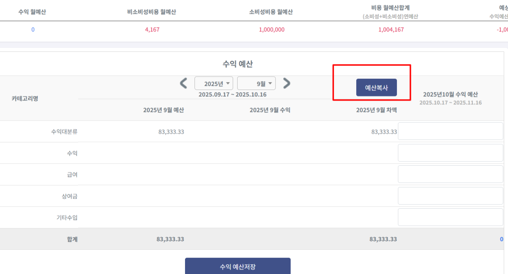 원하는 기간을 선택하신 후 복사한 다음 예산저장버튼을 누르시면 저장됩니다.