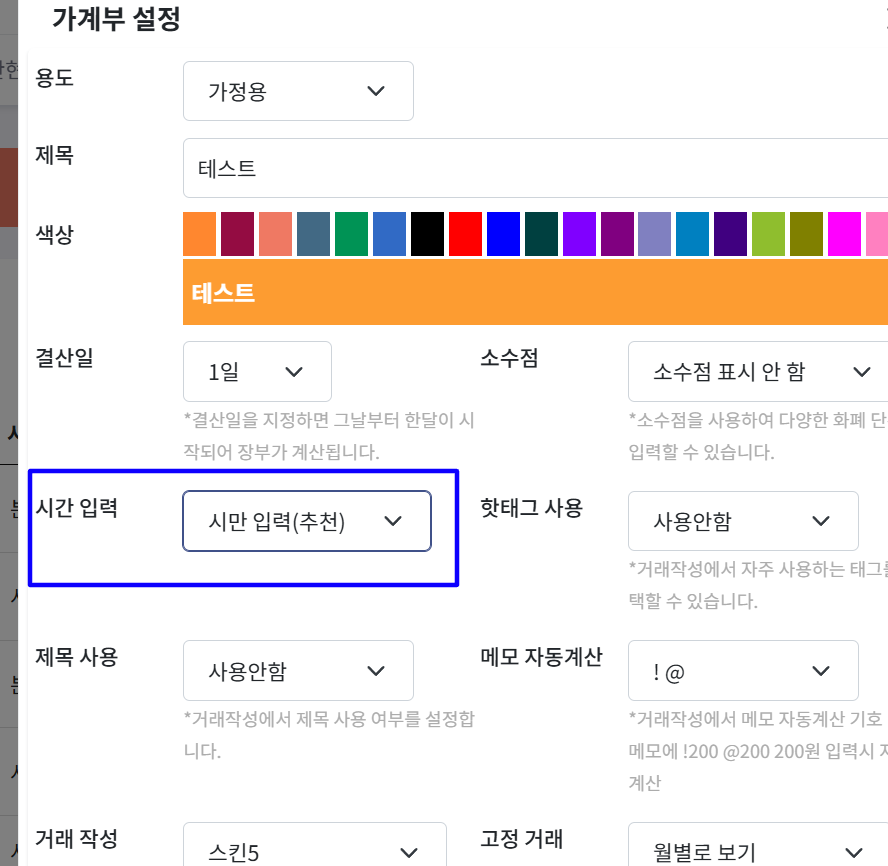 1.설정-가계부관리에서 시/분입력이나 시만입력으로 설정합니다.
