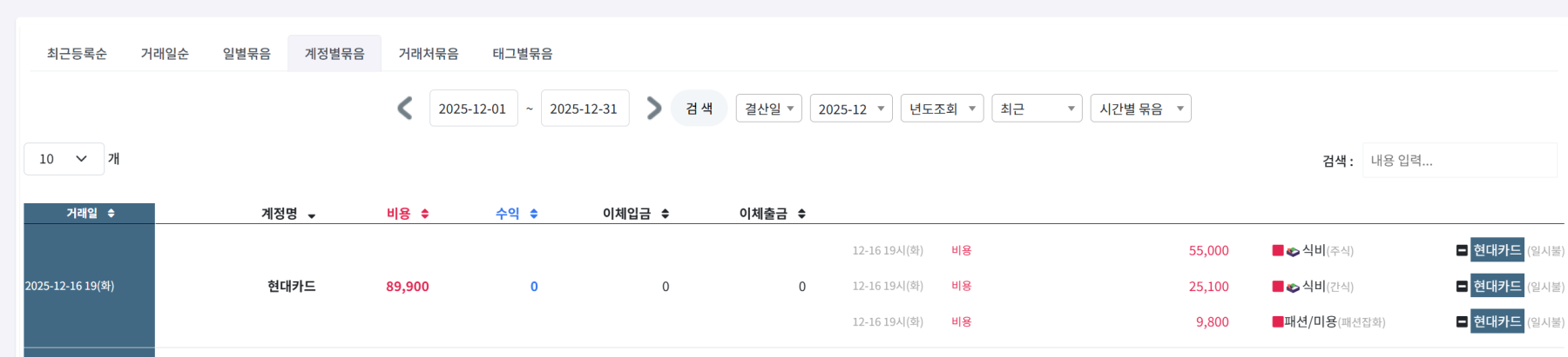 새롭게 계정별 상세내역 기능이 추가되었습니다. 이 기능은 **하나의 거래에 여러 개의 세부 거래(계정)**를 묶어서 통합적으로 볼 수 있게 해줍니다.