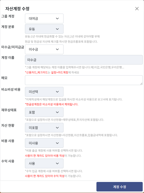 거래내역 미수금을 수정하려고 하면 왼쪽 입금(+)계정에 미수금이 나타나지 않아 수정을 할 수 없습니다.
