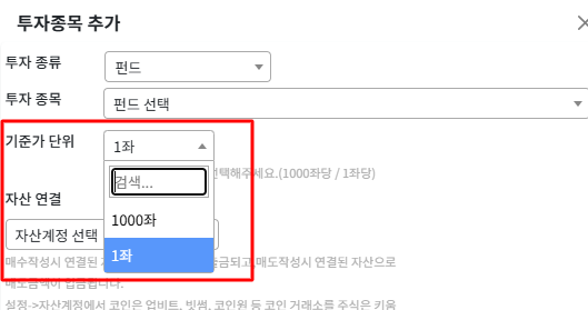 투자종목 추가/수정에서 펀드선택시 기준가 단위를 설정할 수있게 추가했습니다. 펀드는 1000좌당 기준가인지 1좌당 기준가인지 다시 설정해주시면 됩니다.해당 펀드 기준가를 1좌로 설정하시면 됩니다.